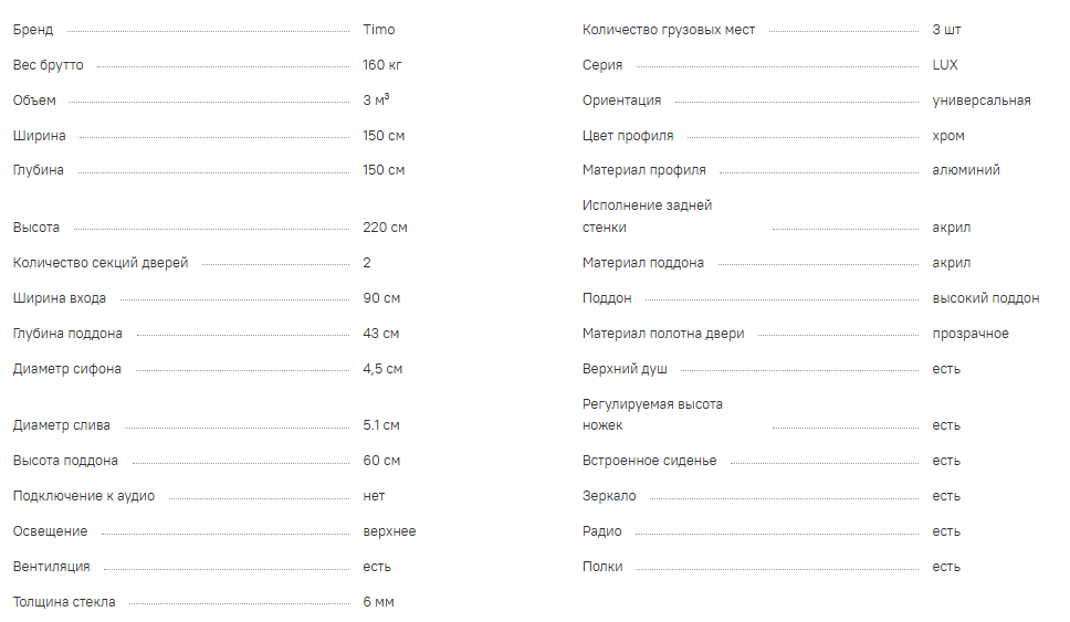 Душевые кабины Timo LUX - минимум стекла и максимум акриловых поверхностей. Такое конструктивное решение несет в себе ряд преимуществ: позволяет осуществлять быстрый и легкий уход за душевой кабиной, являются эталоном надежности, долговечности, удобства и безопасности.